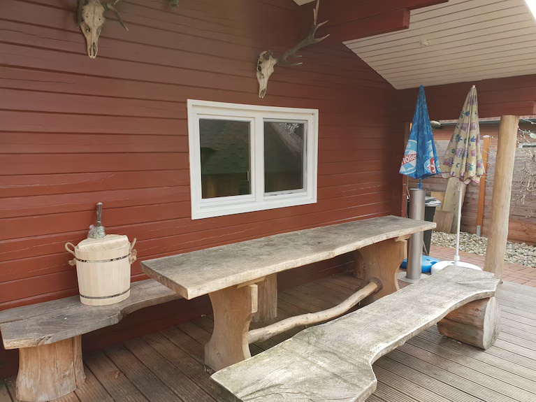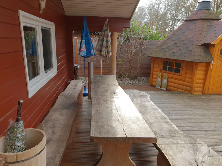 Erleben Sie entspannte Tage im Ferienhaus Wiking direkt am Heeder See in Heede. Das Haus bietet Sauna, Whirlpool (Badezuber), Grillkota und eine große Terrasse – ideal für Familien, Freunde und Gruppen bis 8 Personen. Nur 50 m zum Strand.